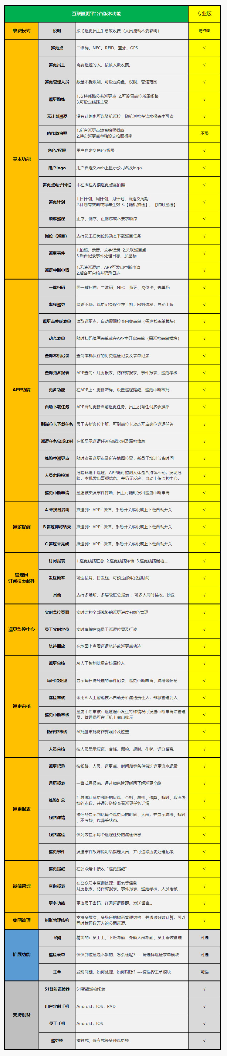 主要功能:功能極為強(qiáng)大,支持集團(tuán)型客戶使用,提供電子圍欄、人員危險(xiǎn)、巡邏中斷申請(qǐng)、按崗位動(dòng)態(tài)下載巡邏任務(wù)、防作弊、中心監(jiān)控等等強(qiáng)大功能,滿足世界頂尖客戶群的需求。 主要特點(diǎn):功能適度強(qiáng)大,滿足大部分客戶需求。 適用對(duì)象:適合大型或?qū)I(yè)型客戶使用。