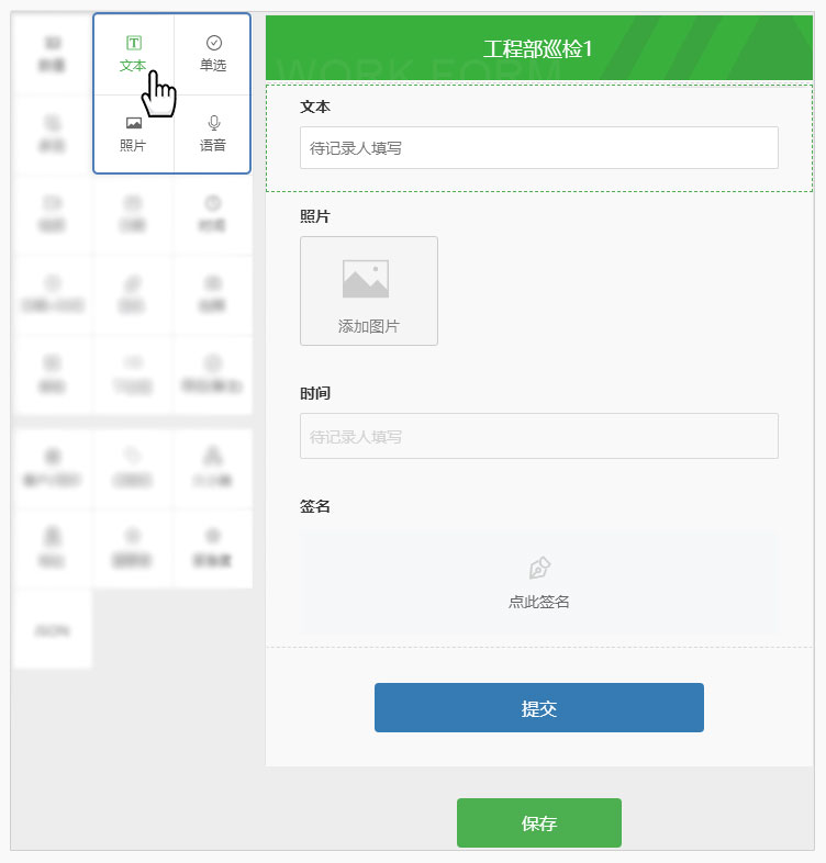 設計設備或場所的工單時,可自定義要檢查的項目, 可添加:單選、多選、數值、視頻、照片、時間、拍照、表格、多列、下拉框等,滿足企業(yè)多樣化需求。